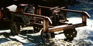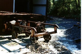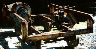 This "mystery car" was originally a light flat car. Work was being done so it could carry two dump car bodies. What you see on it here are a "squirrel cage" blower and motor. They wanted it wto serve as a leaf blower, keepign tracks clear in Autumn. |