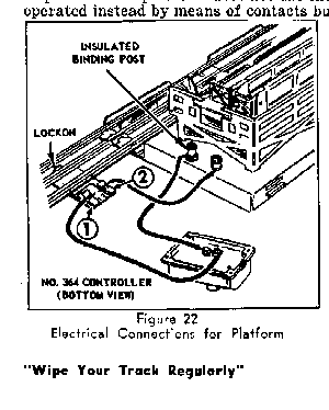 The Operating Stock Car, which loads and unloads miniature cattle from a special corral platform does not use the regular remote control track but is operated instead by means of contacts built into the platform base. The platform base is assembled to a straight portion of the track (either "O" or "027" track may be used) and is wired to a track lockon and to a No. 364C Controller, as illustrated in Figure 22.