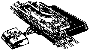 The mechanism of most unloading cars, such as the Milk Car and the Coal and Lumber Dump Cars, is powered by a built-in electrical coil, or solenoid which gets its current from the track through the two sliding contact shoes on the bottom of the car. To operate such cars position them on the remote control section so that both contact shoes rest on the auxiliary control rails (See Figure 16). Then press "Unload" button on the controller.