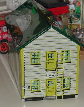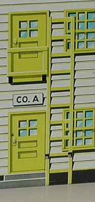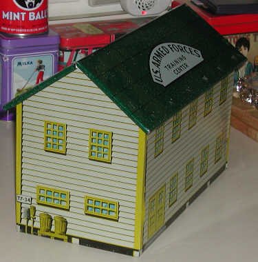 The barracks shown here is amazingly accurate in its basic shape, lithographed details and most of its colors. Barracks were usually pained a white or off-white shade, with green window and door trim. This model uses a greenish yellow, although all real-world examples I saw used a dark green. The lithographers even included the "fire escape", double door to the coal furnace and a couple of trash cans outside. The Training Center barracks is an amazingly realistic and correct model of the real thing.