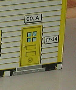 The Marx loco is visible on the bottom of the door. "CO. A" on the top sign means "Company A". The sign reading "T7 - 34" is the house number, and it is replicated at each corner of the building. |