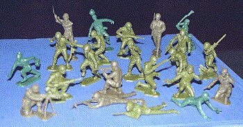 The Louis Marx company made these soldiers, which were often included in Training Center Playsets. They are standard World War II American troops.