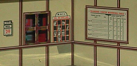 Close-up shows such lithographed details as the calendar, mail slots and training schedule. No doubt the lithographers had first-hand experience in such buildings during World War II. |