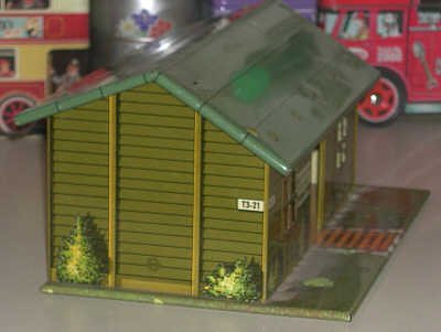 In the 1950s and early 1960s, the Louis Marx Company produced a grand array of historical and military playsets . The sets frequently included a tin-litho building. One popular theme for Marx was its "Training Camp" sets complete with soldiers, equipment, vehicles and a tin building. The simple building shown here is interesting, as the basic form was used for everything from construction sites to Wild West cavalry barracks. The only change was in the lithography itself. This particular building was one of the types of tin structures that might be included in various versions of the Training Camp playsets.