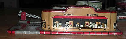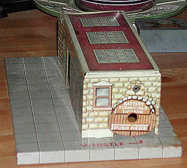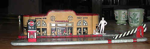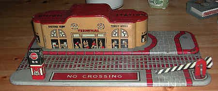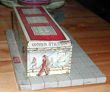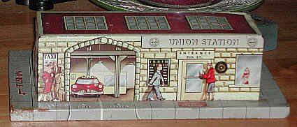 This Union Station was produced for many years. It is a fine example of original Marx tin-litho. Though obviously undersized and off-scale, the lithography exhibits excellent attention to detail. At the time it was introduced, the Union Station's Art Deco style was state-of-the-art. |