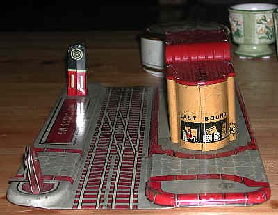 Here an O Scale figure is placed beside the station. If "scale," the station would be smaller than HO. It might be "scaled" at TT (1/120). |