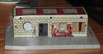 This Union Station is closer to scale. Note the detailed lithography, right down to the parcels on the baggage truck. A small plastic awning is missing from this piece. |