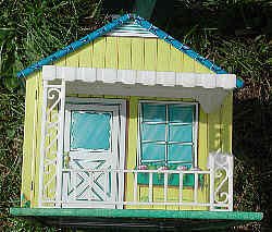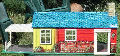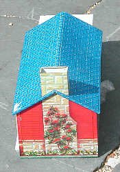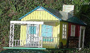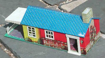 This tin dollhouse by Wolverine is a beautiful example of tin-lithographed toys. It is almost a yard long, and like other tin toys has its details "painted" on. The style is of a "modern" suburban house on the 1950s. Note the car port. |