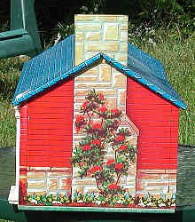End view has a rose bush climbing the chimney. |