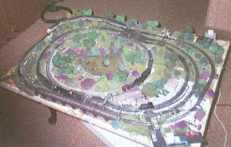 | The next three photos show our own 32" by 40" layout. The background shows just how small this layout is! Our own layout has 3 loops, a lake, and two tiny stations. Look closely - you can see a Lackawanna E8 with the Phoebe Snow passenger liner, an RS3 haulking the local, and a work train on the middle arc. The beauty of N scale is that it can fit almost anyone's living space and it looks beautiful! | ![]() |