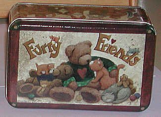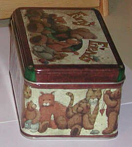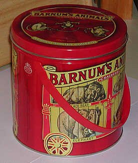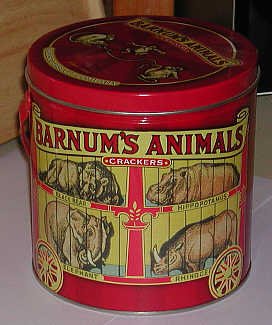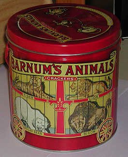 This tin has nice images. It is older than the other animal cracker tin on our site, and differs in various details. This tin is shorter, wider, and has larger pictures. |
