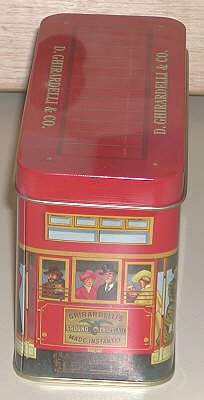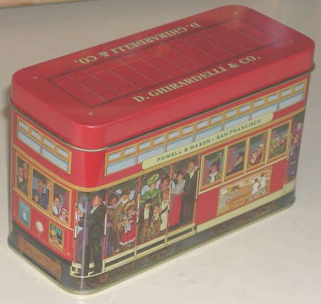 Here is a tin fro ma West Coast candy company, based on San Francisco's famed cable cars. This is great lithography. you can see the individual passengers clearly.