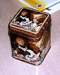A holiday tin - note child, doll and building blocks. |
