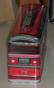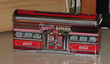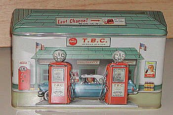 Diners and gas stations are a favorite theme of artists hoping to capture the not-too-distant past. Indeed, for many of us the old-fashioned diner is part of the daily routine. Naturally, these stops along the highway have become subjects for designers of tins. Our good fortune is finding some fine tins that are miniature diners and gasoline stations.