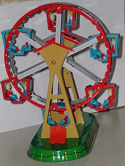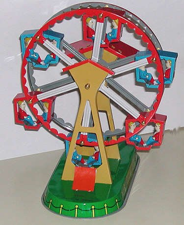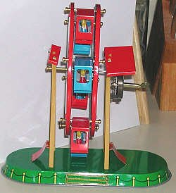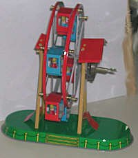 This is a modern copy of a classic tin toy. It is simple enough - wind the key and the ferris wheel turns.