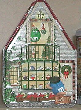 The inspiration for these tins goes without saying. They are whimsical representations of the candy that's not supposed to melt in your hand. The phone booth is very much like those from England. The house is hilarious!