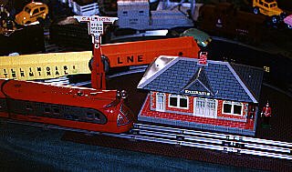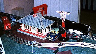 Tin litho station and automobile, with a tin crossing sign. |