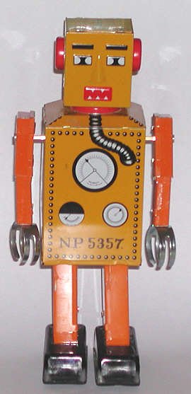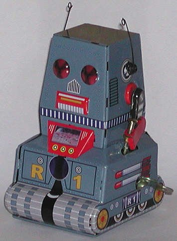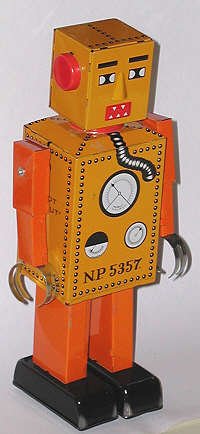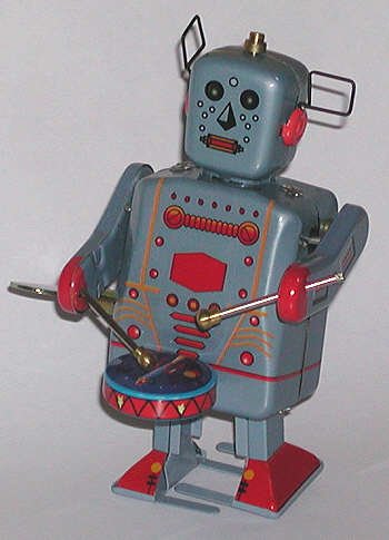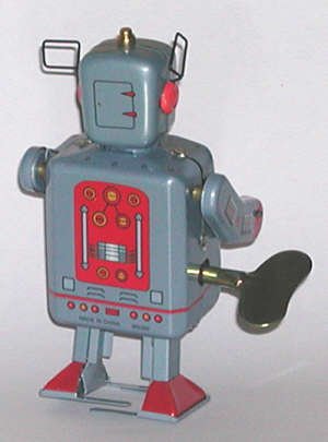 One of the most common toys of the 1950s and 1960s was the small, wind-up tin robot. They were found in five-and-ten-cent stores, discount stores, toy stores, and were also sold by street vendors. There were robots who bounced, jumped, drove, played music, and any number of other things. These days the tin robot is a "collectible," but they retain all their charm.