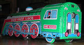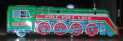 These battery-powered locomotives were popular in the 70s and 80-s. They ran wildly, changing direction if they ran into an obstacle. The headlights flashed, and they made sounds or played music. Kids loved the wild motion, lights and sound. Parents hated all the ruckus caused by these trains. We called them "payback toys" because were you interested in annoying someone, all you had to do was buy one of these for their children. |