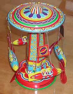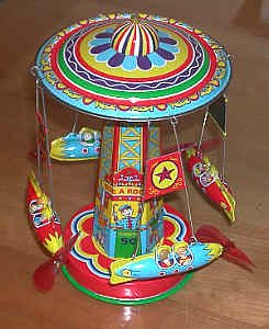 Spring-type tin carousel, a reproduction by Schylling. Note the ticket booth on the pylon. This toy features the intricate art so common on older tin toys. |