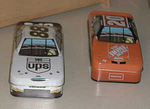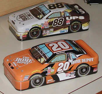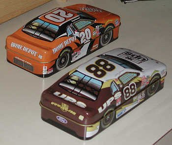 More of the slick racing car tins. This pair has the same superb window art, with different interior views from each side. |