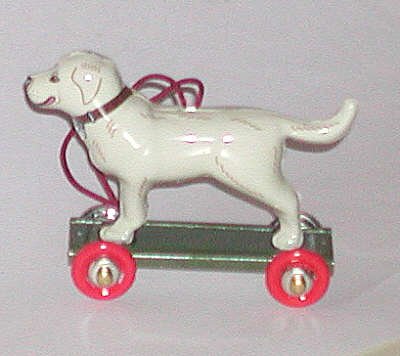 Toys like this were called "penny toys" in England. This dog has interesting lithographed details. |