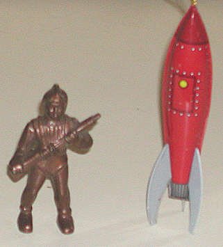 The rocket was sold as a tin Yule ornament, and has a yellow cord fitted to the top. It is typical of the rockets seen in old science fiction movies. Spaceman is from the same era, but he is made of plastic. |