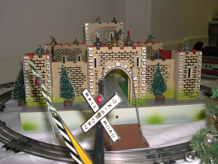 Situation? Every year during the Yule season we participate in a train display at Ocean Grove, NJ. We run the old O gauge and O27 trains, hence the odd track. This castle is a popular part of the display. Knights and trains? The children like it.