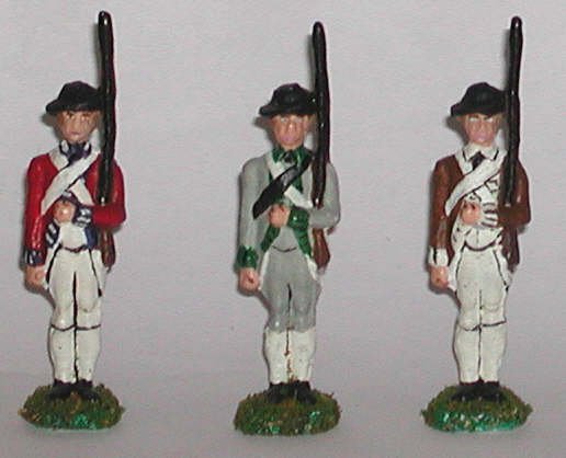 Color can make a big difference for the Revolutionary War. The cut of clothing was pretty consistent, and military uniforms followed their current civilian fashions. These fellows came from a mold sold as a Revolutionary War U.S. Marine. A distinguishing feature of Marines was a brimmed rather than cocked hat. Other units also wore brimmed hats,. In fact, the brimmed hat was as common among civilians as the cocked hat, or tricorn. In militia units where "uniforms" were a relative thing, men wore whatever headgear they had.
