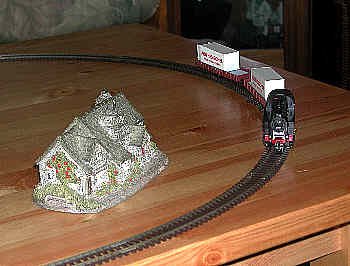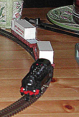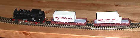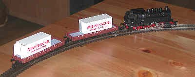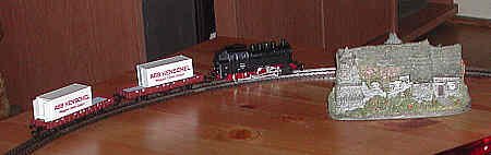 We finally managed to get the start of a TT railroad. Here's the first of it: a small 0-8-0 locomotive of German design, German flat cars with containers and an oval of track. Two of the five cars were all we needed to start. It ran on a coffee table the first time. Our hope is to eventually build a small TT display railway which can run two or three such trains simultaneously.