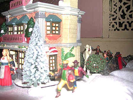 Toy shop - Scandinavian woman to left. To the right are ice skaters and...tin Tom Mix cowboy in white suit. He is an old lead figure, added for fun. In front, Matt and Sean have heard someone yell, "Free train rides," so they are off and running |