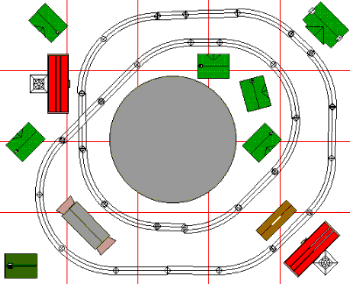 Crossover layout - buildings illustrate how one might handle scenery (7) O27 single straight (16) O27 O-27 curve 45° (1) O27 cross 45° (4) O27 half straight Total of 28 items