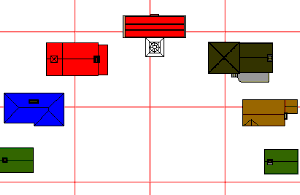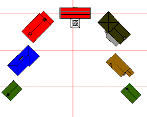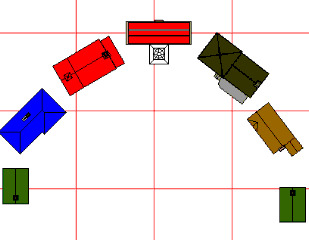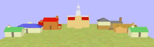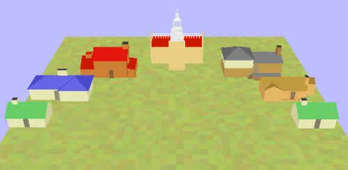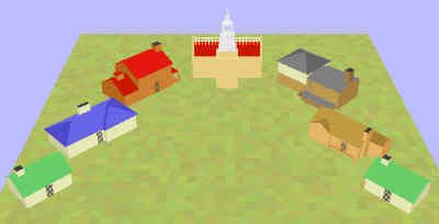 Semi-circular placement with buildings at an angle. This forces the focus to the central building and the area fright in front of it., This is excellent if the emphasis in your scene is intended to be the central building and the activity to its immediate front. |