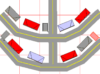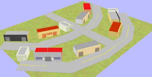 This blends a semi-circular row of structures with a linear row., and is good in cases where the rear line of buildings is backed against a Yule Tree or other obstruction. |