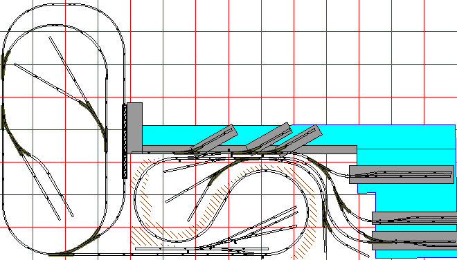 Here we append the previous layout (#8) to the left corner of the oval layout. You can treat the oval layout as higher ground, and thus would connect with the switch at the bottom of the portside layout. If it is water-level, then connect as shown with the pierside line of the portside pike. |