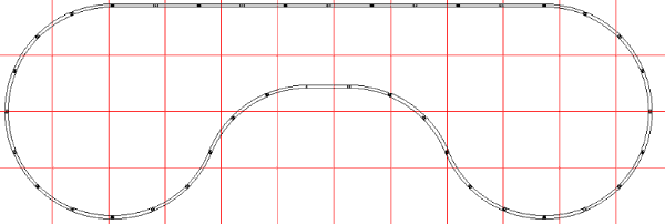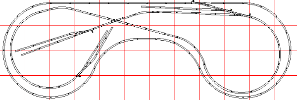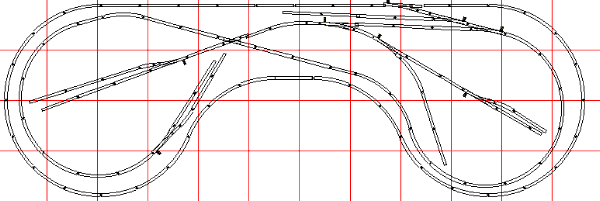 Note the cunning addition of sidings to the right, which include a "short cut". Again, 18" curves are used inside the dogbone, while the dogbone itself has 22" radius curves. |