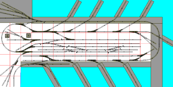 Here is the basic layout, using standard switches (gray) and #4 switches, 15" radius curves and 30 degree crossovers. The yard in upper left can be a sort of staging area for carloads brought in via the rightmost spur. It can also service a local portside industry. The yard at lower left and center is the interface with a main freight railroad. Note that there is a reversing track inside the loop. You would do best to insulate track inside the half-dogbone. The sidings inside the left loop are engine and car facilities for the port railway. |
