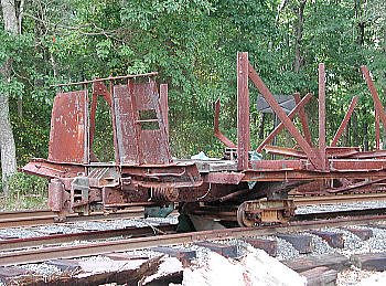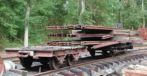 Flat with metal "bulkheads" and stakes is actually a caboose frame from from the Carroll Park & Western; caboose was ex-Lackawanna R.R.- note the very small trucks and wheels. which are for shop service. |