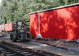 The front end tractor sets rail in place. A problem at Pine Creek is matching differeing rail weights and profiles. Most rail is donated.