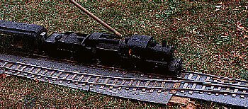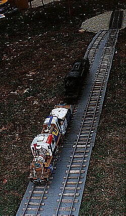 Pete's train is special. He made it all himself, and the main ingredient is tin cans of varying sizes! Nonetheless, the end result is a scale model of a real train. Pete occasionally brings his hand-made railway to the Pine Creek Railroad, usually for special occasions. He sets up the long track with its turntables at each end. Children get a chance to help power the train. Power? Each locomotive has a fitting for a long wooden handle. The trains are pushed by hand. Once it reaches the end of the line, it gets turned around on the turntable for the next run.