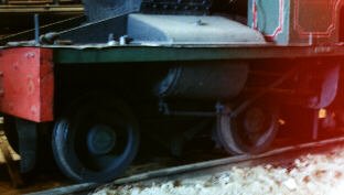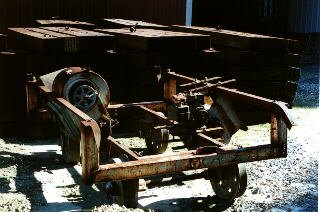 This "mystery car" was originally a light flat car. Work was being done so it could carry two dump car bodies. What you see on it here are a "squirrel cage" blower and motor. They wanted it wto serve as a leaf blower, keepign tracks clear in Autumn. |