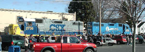 The crowd is lined up alongside CSX GP32-2 and Conrail GP38 |