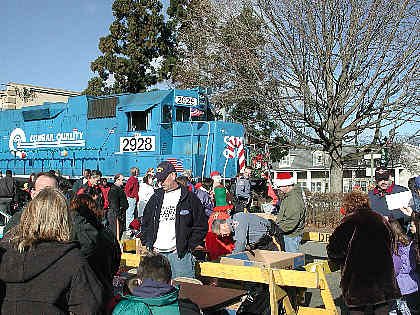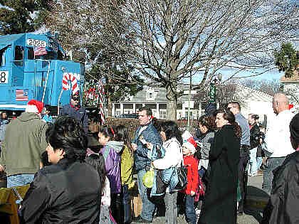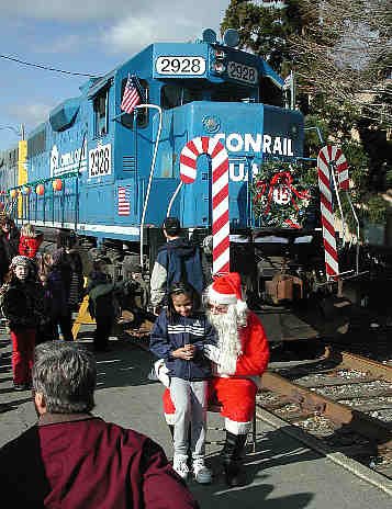 Kids have a great time meeting Santa and getting close to a large diesel locomotive. |