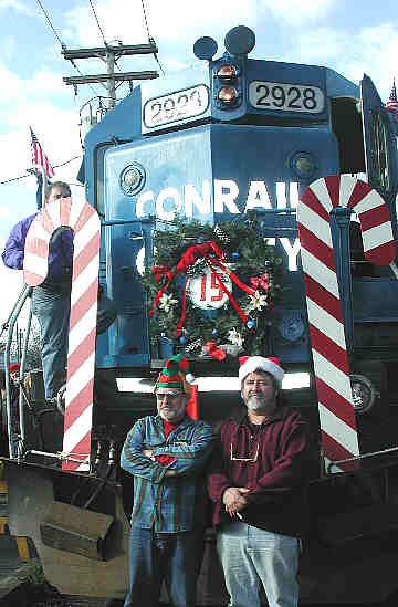 Here's the brakeman and engineer, stadning proudly before their candy-cane and flag- bedecked GP28 locomotive |