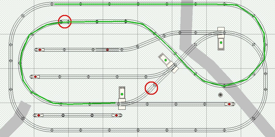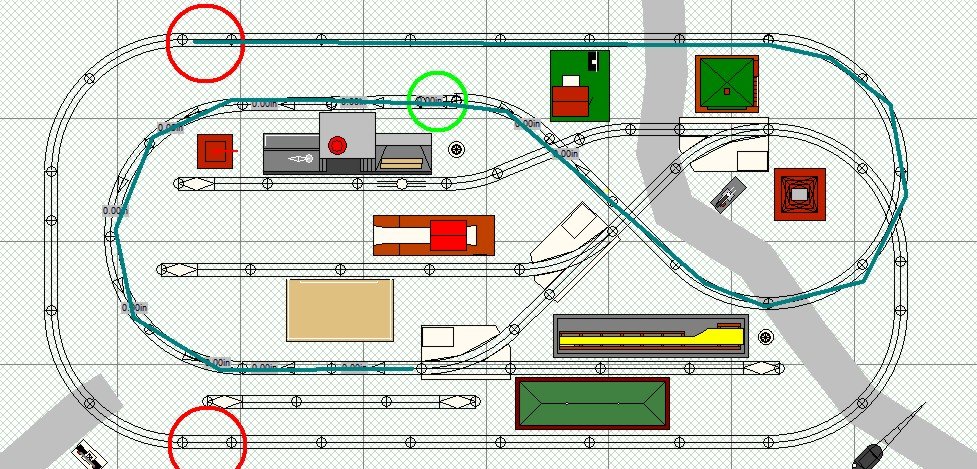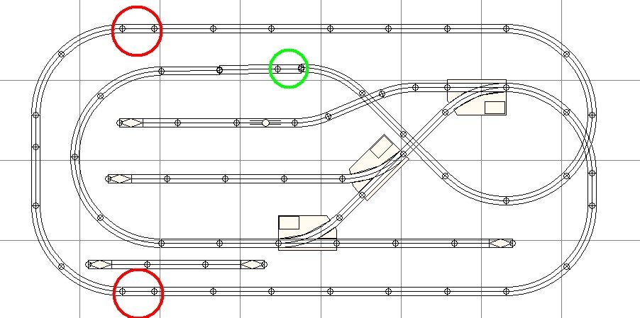 elevated track. Green circle is cut-to-lenght section. Red circles are