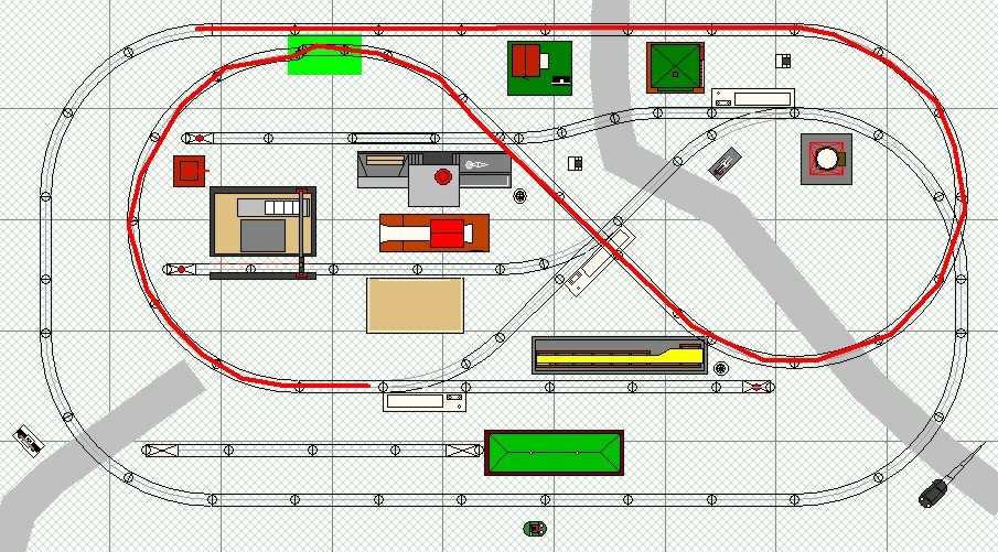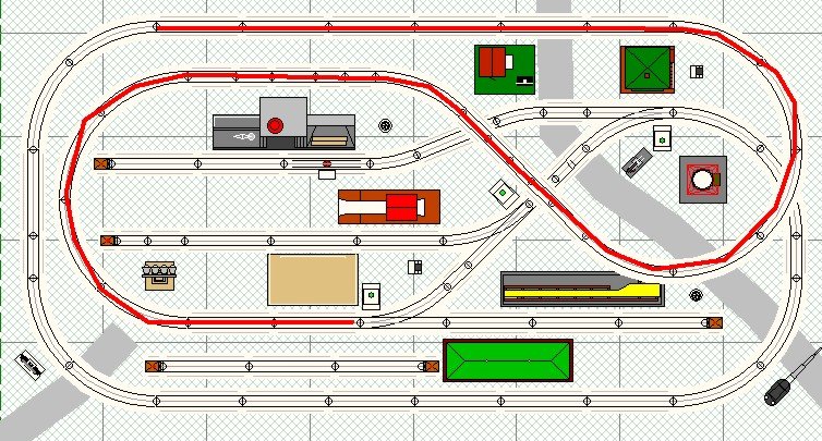 Red line is incline and elevation Item list for layout-classic-crossover4x8-MTHs.rrt NUMBER (27) 40-1001 RealTrax 10.0 in straight (1) 40-1029 RealTrax 5.0 in insulated straight (2) 40-1005 RealTrax O31 LH turnout (18) 40-1002 RealTrax O-31 curve (4) 40-1016 RealTrax 5.0 in straight (2) 40-1022 RealTrax O-31 half curve (1) 40-1004 RealTrax O31 RH turnout (7) 40-1018 RealTrax 3.5 in straight (4) 40-1017 RealTrax 4.25 in straight (2) 40-1012 RealTrax 5.5 in straight (5) 40-1024 RealTrax track bumper (1) 40-1008 RealTrax uncoupling track (1) 362 Lionel postwar barrel loader (1) 145 Lionel postwar automatic gateman (1) 445 Lionel postwar railroad switch tower (1) 193 Lionel postwar industrial water tower (1) 356 Lionel postwar operating freight station (1) 464 Lionel postwar lumber mill (1) 352 Lionel postwar ice depot (1) 3356 Lionel postwar horse car platform (1) 195 Lionel postwar floodlight tower (2) 148 Lionel postwar dwarf block signal (1) 155 Lionel postwar ringing signal (1) 252 Lionel postwar crossing gate (1) 140 Lionel postwar banjo signal (2) 71 Lionel postwar lamp post |