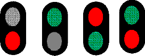 Green over Red: SLOW! Be ready to stop at next Red signal!