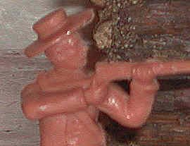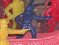 Crude molding, these figures are too fluid and lacking detail. Note blue figure with snub-nosed revolver, a weapon that was not used in the Wild West. |