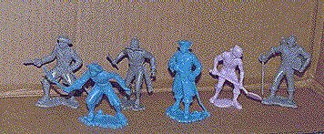 As Medieval figures go, compare Marx 60mm knights with the 54mm figures included in the reissue Marx castle, Airfix men-at-arms and the Black Knight Britains clones. Marx's 60mm figures lack detail of later figures, yet make up for it with superb animation and realistic poses. The 54mm knights are awful, liquiferous-looking lumps stiffly wielding their weapons. The Airfix figures have good detail and animation, but not as much character as the 60mm Marx figures. The Britains clones have great detail and very energetic animation. Though their type of detail differs from the Marx 60mm figures and the Airfix troops, it works well with them thanks to their highly-animated poses.