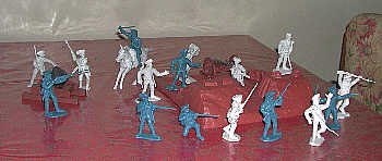 The Alamo set went through many permutations. It came complete with Texans and frontiersmen, mexicans and indians. Yes, Indians - maybe not good history, but good playtime! And the Mexicans had many uses. An Alamo set was both a fort and a place to play Zorro. Because so many of the troops were molded in blue shades, they often ended up mixed with Civil War soldiers.